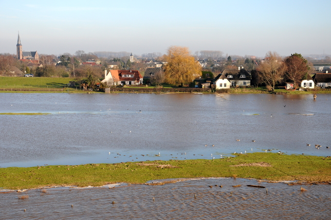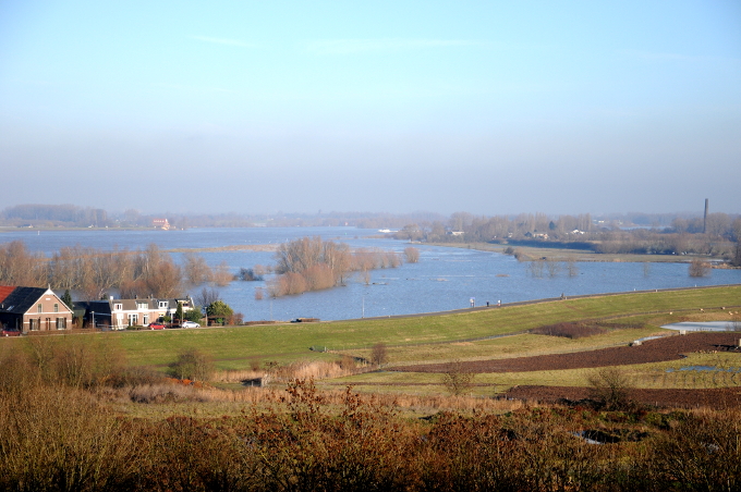 Foto onder: de uiterwaarden zijn overstroomd. Links de Ooijpolder.
