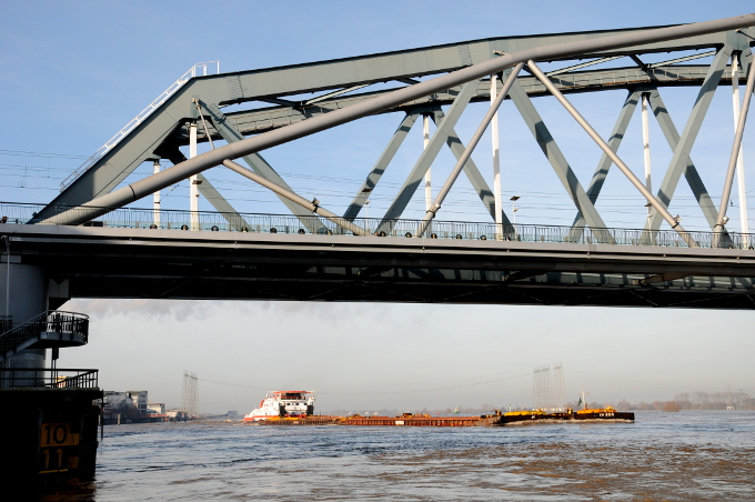 Nijmegen, 10.01.2011 Nijmegen maakt zich op voor de hoge waterstand van de Waal. De grote deuren die de benedenstad beschermen tegen hoog water zijn gesloten. Een doorgang wordt dicht gemaakt met een schottensysteem dat bij de verhoging van de Waalkade is aangelegd. Aan de overkant in Nijmegen-Lent heeft de bewoner van een huis een loopsteiger geplaatst. De waterstand wordt niet zo hoog als eerder verwacht. Na de hoge waterstanden in 1993 en 1995 zijn in Nederland de rivierdijken verhoogd.