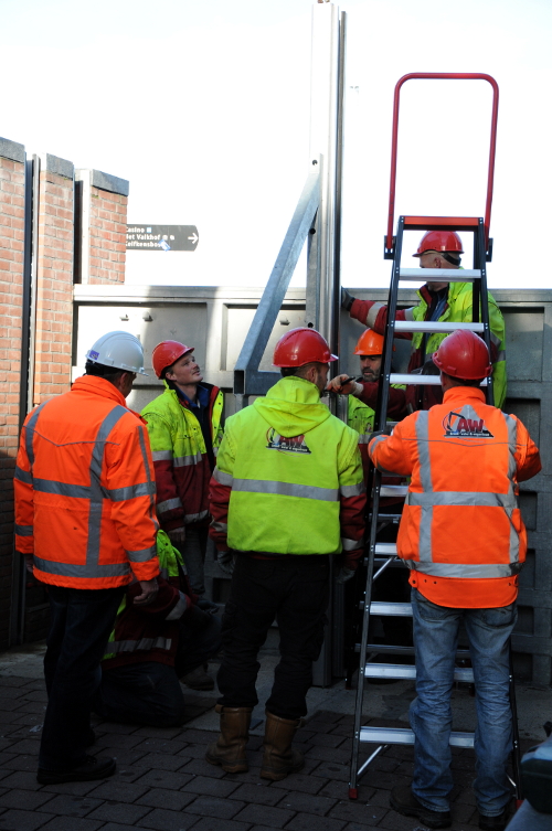 Foto onder: de zogeheten coupures (openingen van de kadewand voor het verkeer) worden gesloten. Vroeger werden hier houten schotten geplaatst met paardenmest ertussen.