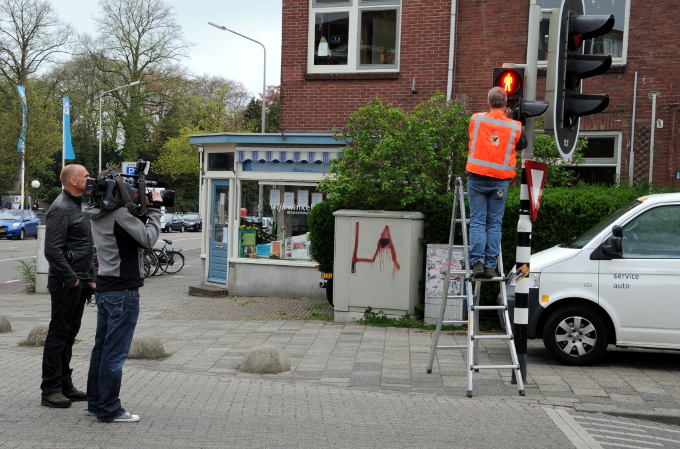 Foto boven: Het voetgangerslicht wordt in oorspronkelijke staat hersteld door de gemeente Nijmegen. De tv zender SBS 6 maakt een reportage voor het programma Hart van Nederland.