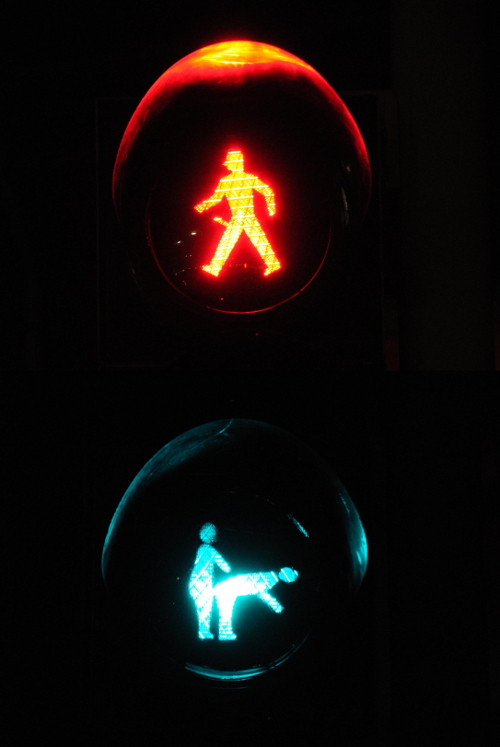 Nijmegen | 12.04.2011 Onbekenden hebben in Nijmegen voetgangerslichten bewerkt tot erotische voorstellingen. Bij daglicht vallen de voorstellingen niet op, maar in donker zijn ze goed te zien. De gemeente Nijmegen gaat de voetgangerslichten weer in de oude staat herstellen.