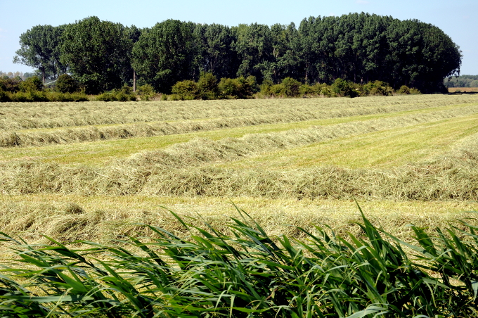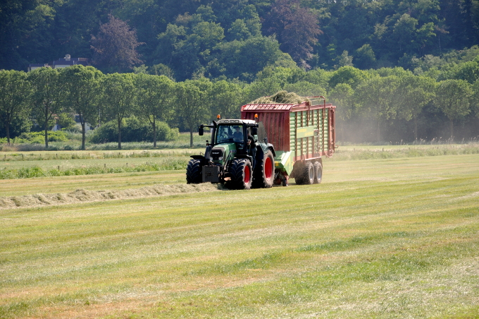 In de Ooijpolder bij Nijmegen wordt hooi van de velden gehaald. Komende week wordt regen verwacht.