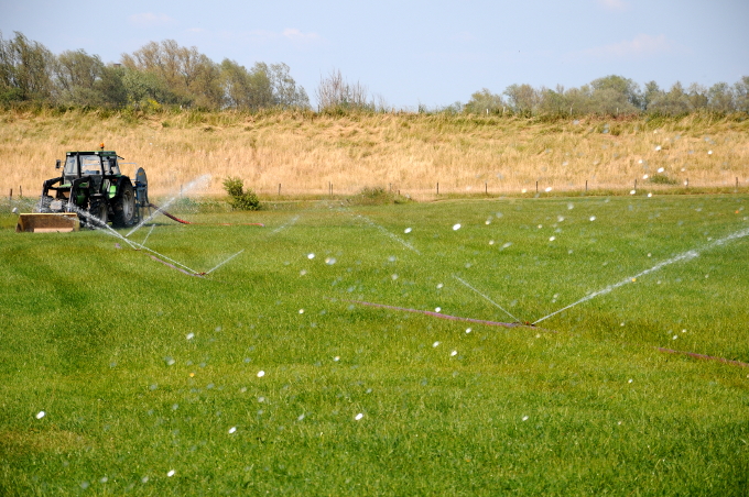 Een weiland wordt beregend met slootwater. Op de achtergrond het vergeelde gras van de dijk.
