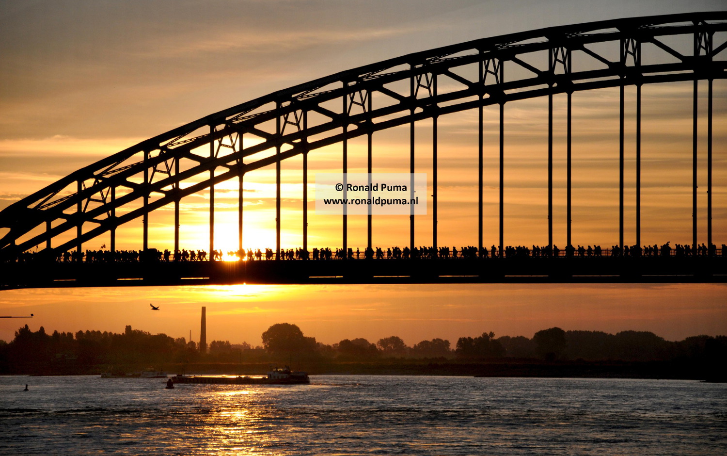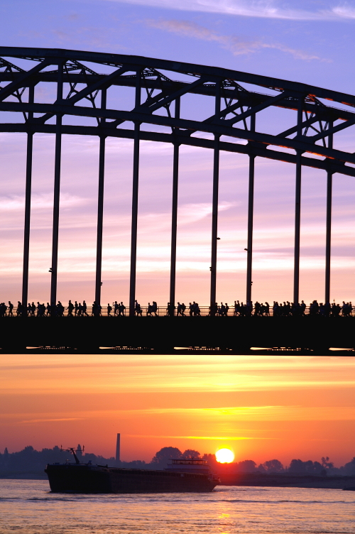 Wandelaars die meedoen aan de Vierdaagse wandeltocht van Nijmegen lopen bij een opkomende zon (05.48 uur) over de Waalbrug op de eerste dag richting Elst. Deze foto hangt bij de foto-expositie over de Waalbrug in de Stratemakerstoren aan de Waalkade (13 juni t/m 18 september 2011).