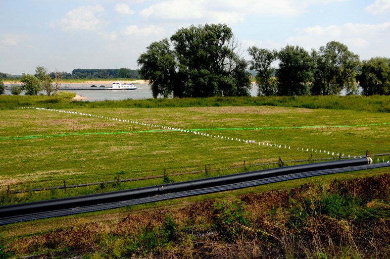 De plaats waar de nevengeul gegraven gaat worden in de uiterwaarden van de Waal is gemarkeerd met witte vlaggetjes. Leidingen worden verplaatst.