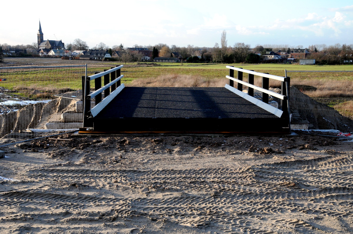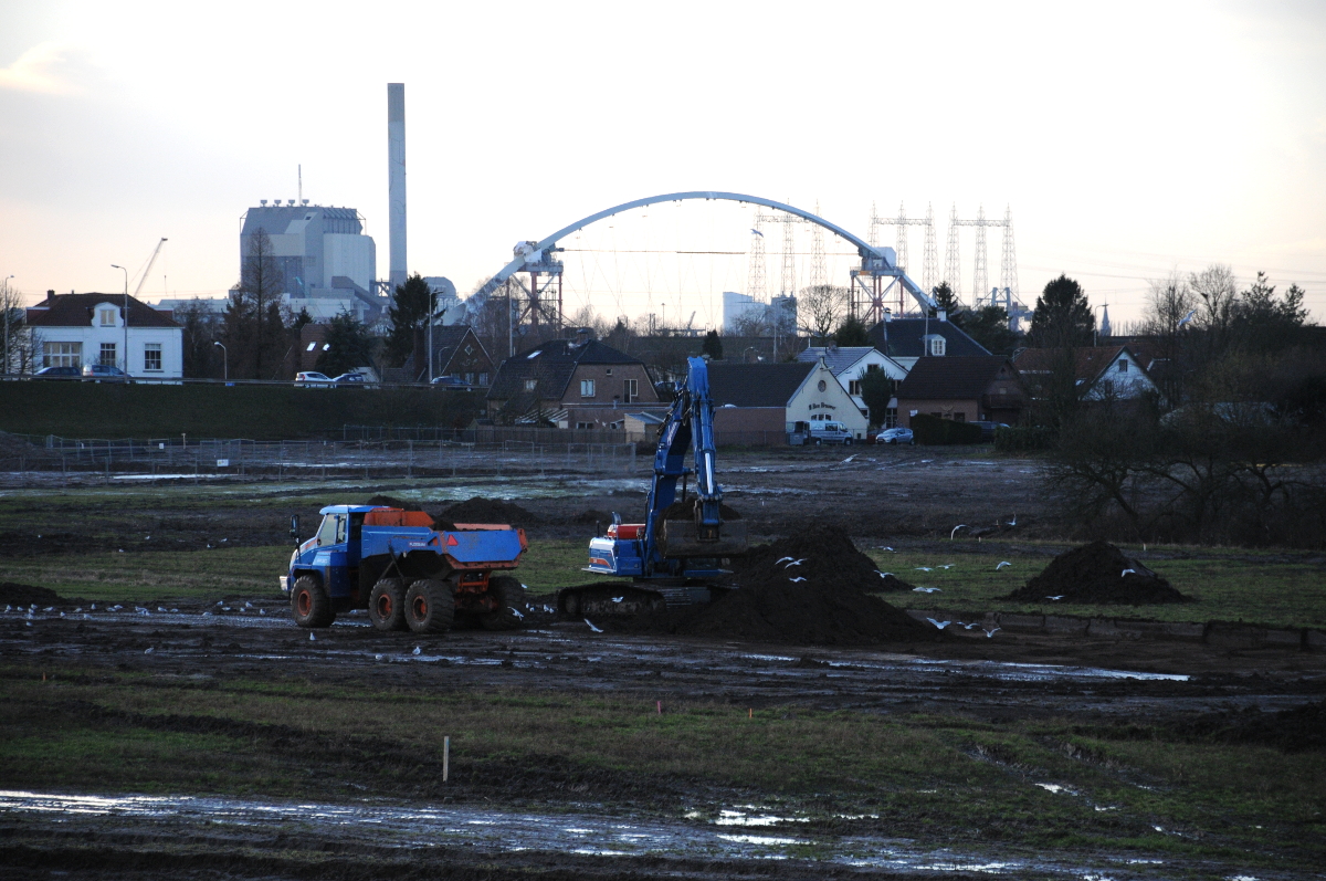 De graafwerkzaamheden zijn begonnen. Op de achtergrond de elektriciteitscentrale en de nieuwe brug in aanbouw. Foto onder: een nieuw bruggetje ligt klaar voor gebruik.