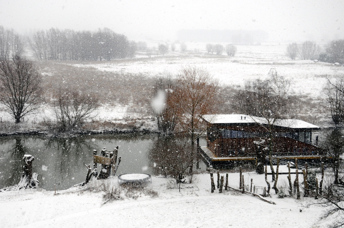 Woonark in een zijarm van de Waal in de sneeuw, op de achtergrond de Ooijpolder.