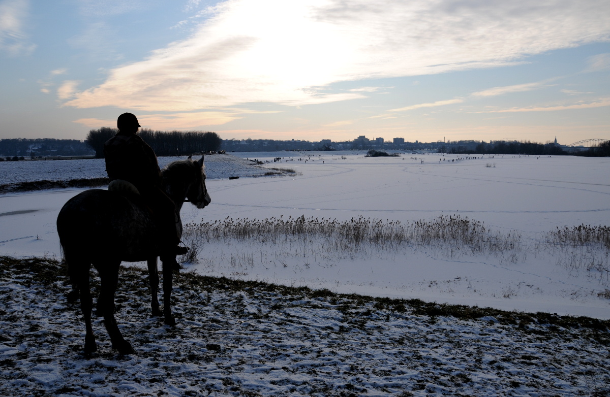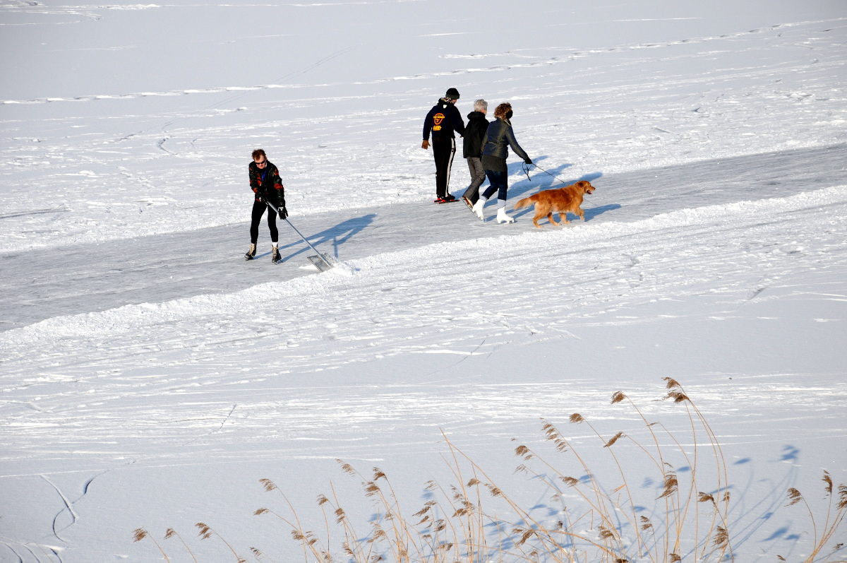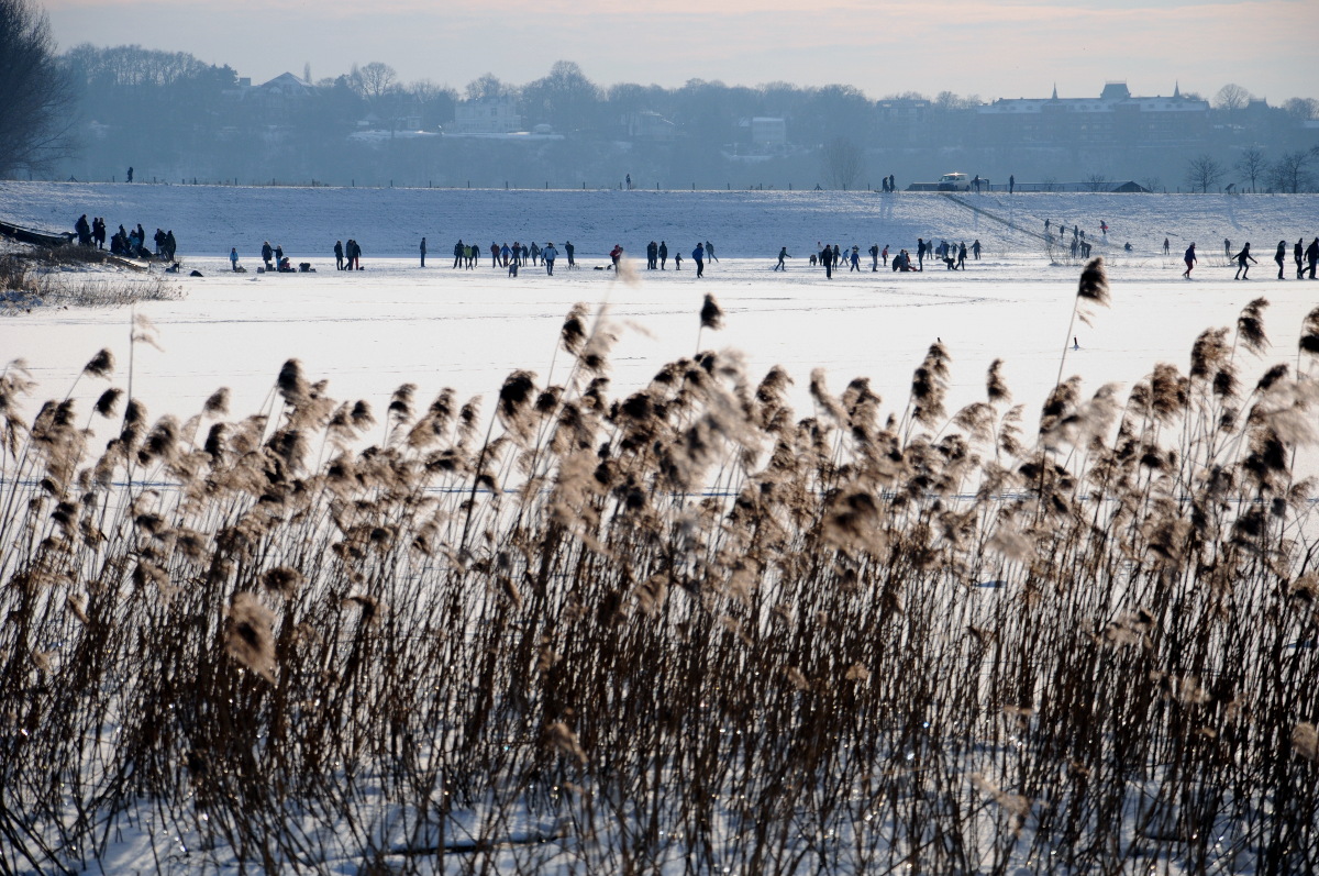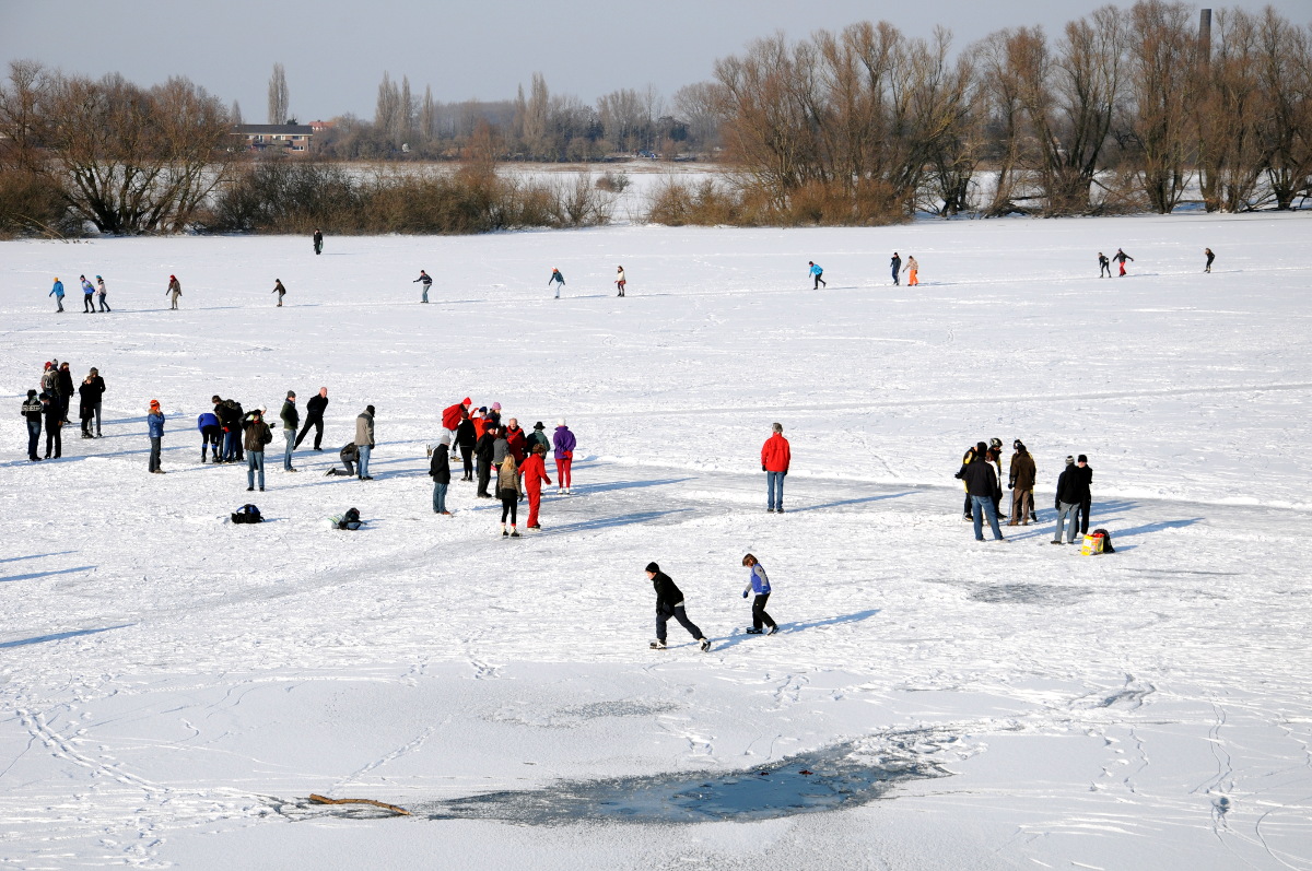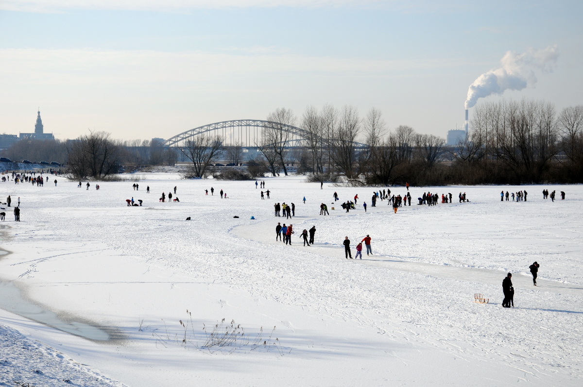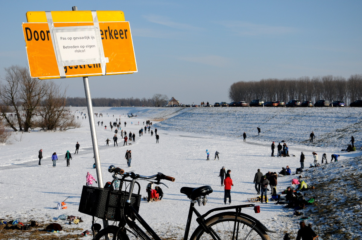 Ondanks de waarschuwing voor gevaarlijk ijs wordt er volop geschaatst op de Oude Waal bij Nijmegen. De afgelopen dagen zijn enkele mensen door het ijs gezakt. Een vrijwilliger heeft een parcours sneeuwvrij gemaakt, het ijs is daar goed, maar er zijn op andere plaatsen enkele zwakke plekken. Het is een zeer fraaie dag met weinig wind en veel zon.