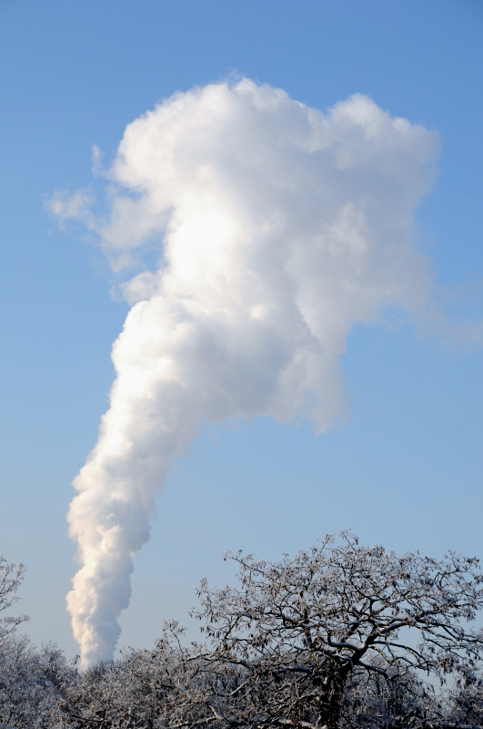 De rookpluim van de electriciteitscentrale van energiemaatschappij Electrabel gaat door het windstille weer bijna recht de lucht in.