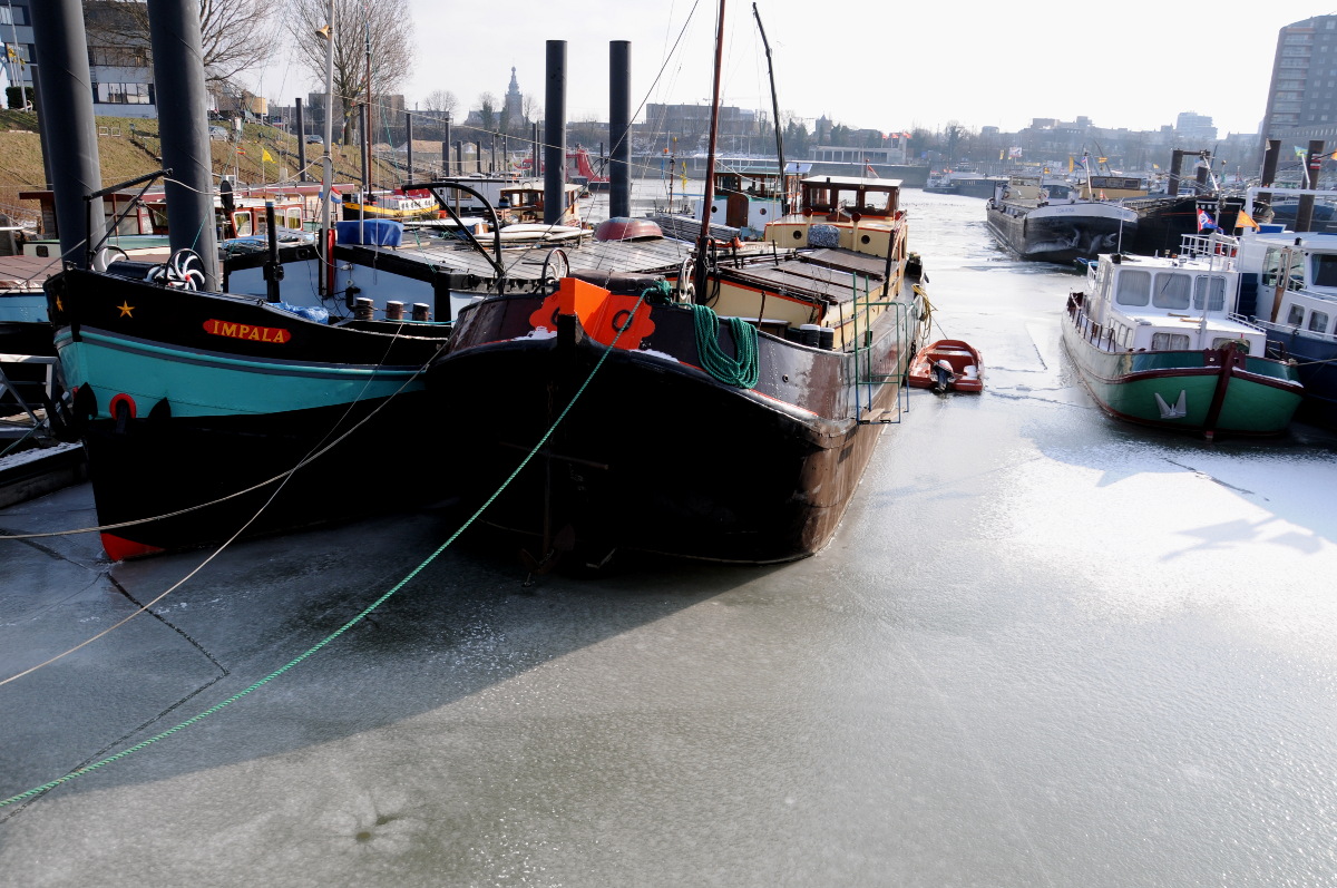 De kou houdt aan tot komend weekend. In ’t Meertje, een zijarm van de Waal, drijven de woonarken tussen de ijsschotsen. De waterstand is weer laag na het hoge water van januari. In de haven van Nijmegen liggen de woonschepen in het ijs, maar problemen levert dit niet op.