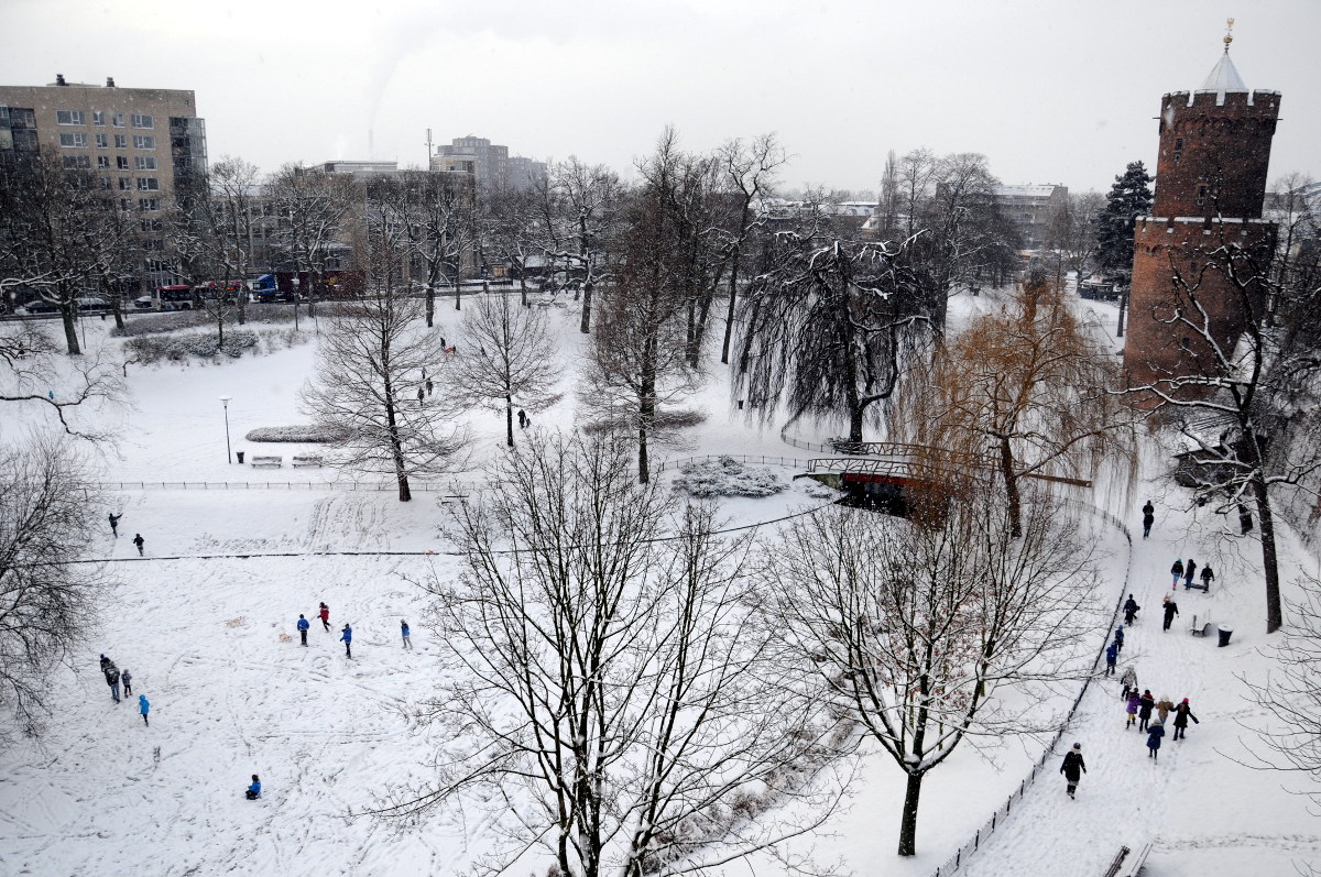 In het Kronenburgerpark zorgt de sneeuw voor plezier.