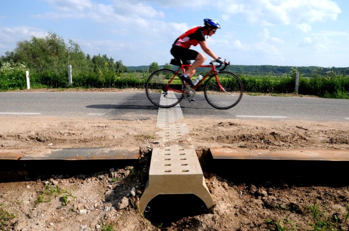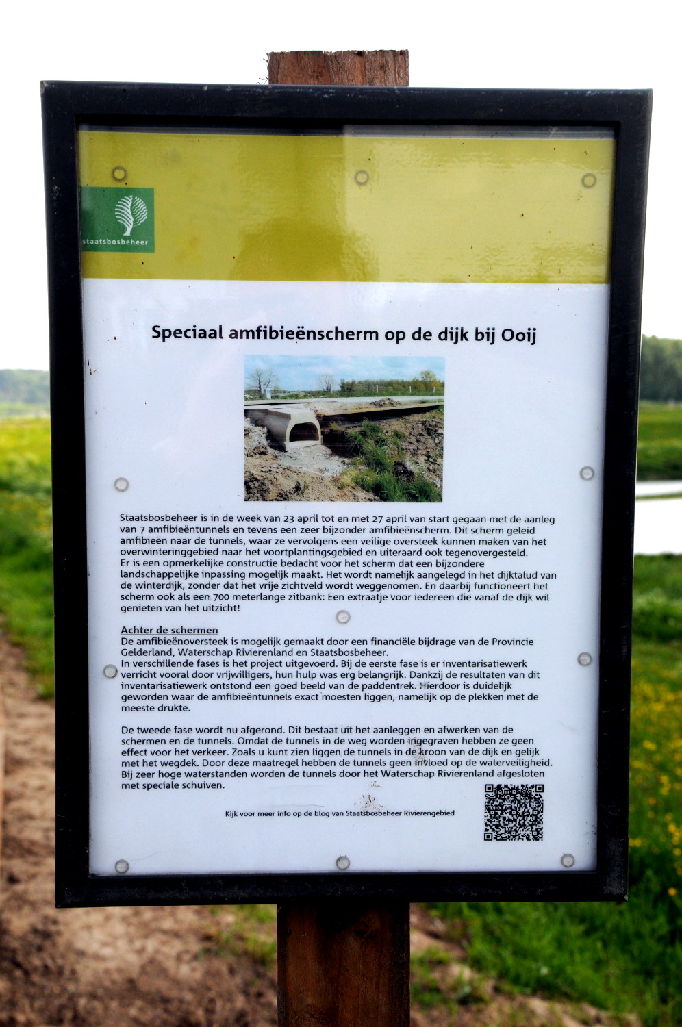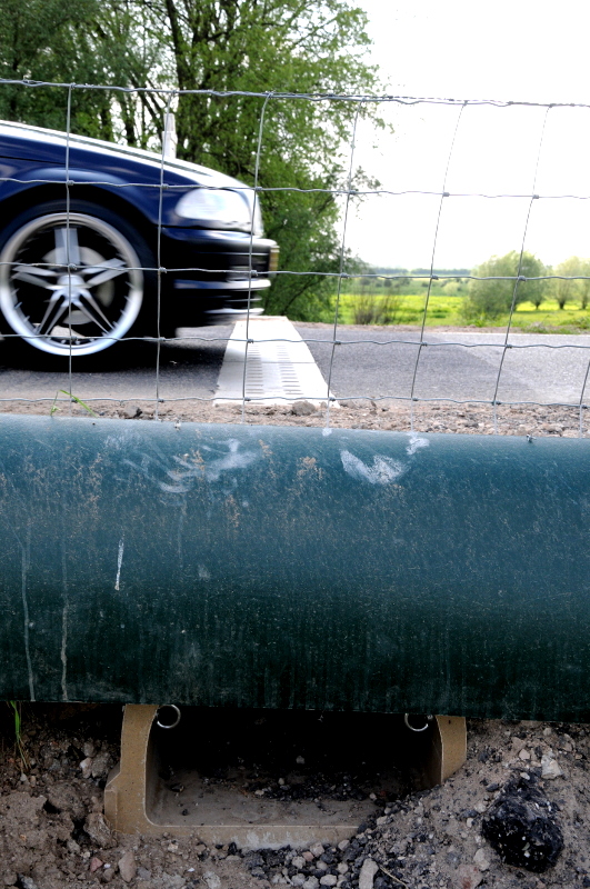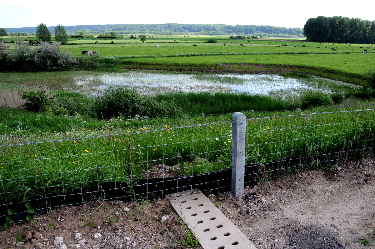 21.05.2012 | Nijmegen In de Ooijpolder bij Nijmegen zijn 7 amfibieëntunnels in de bovenkant van een paar honderd meter dijk aangelegd. Aan beide kanten van de dijk houdt een scherm (een van plastic, een van metaal) de kikkers, padden en amfibieën tegen en geleidt hen naar een tunnel. Ze kunnen op deze manier de dijkweg oversteken, van een paddenpoel in de Ooijpolder naar de Oude Waal en terug, zonder doodgereden te worden. (Klik op de foto’s voor groot formaat).