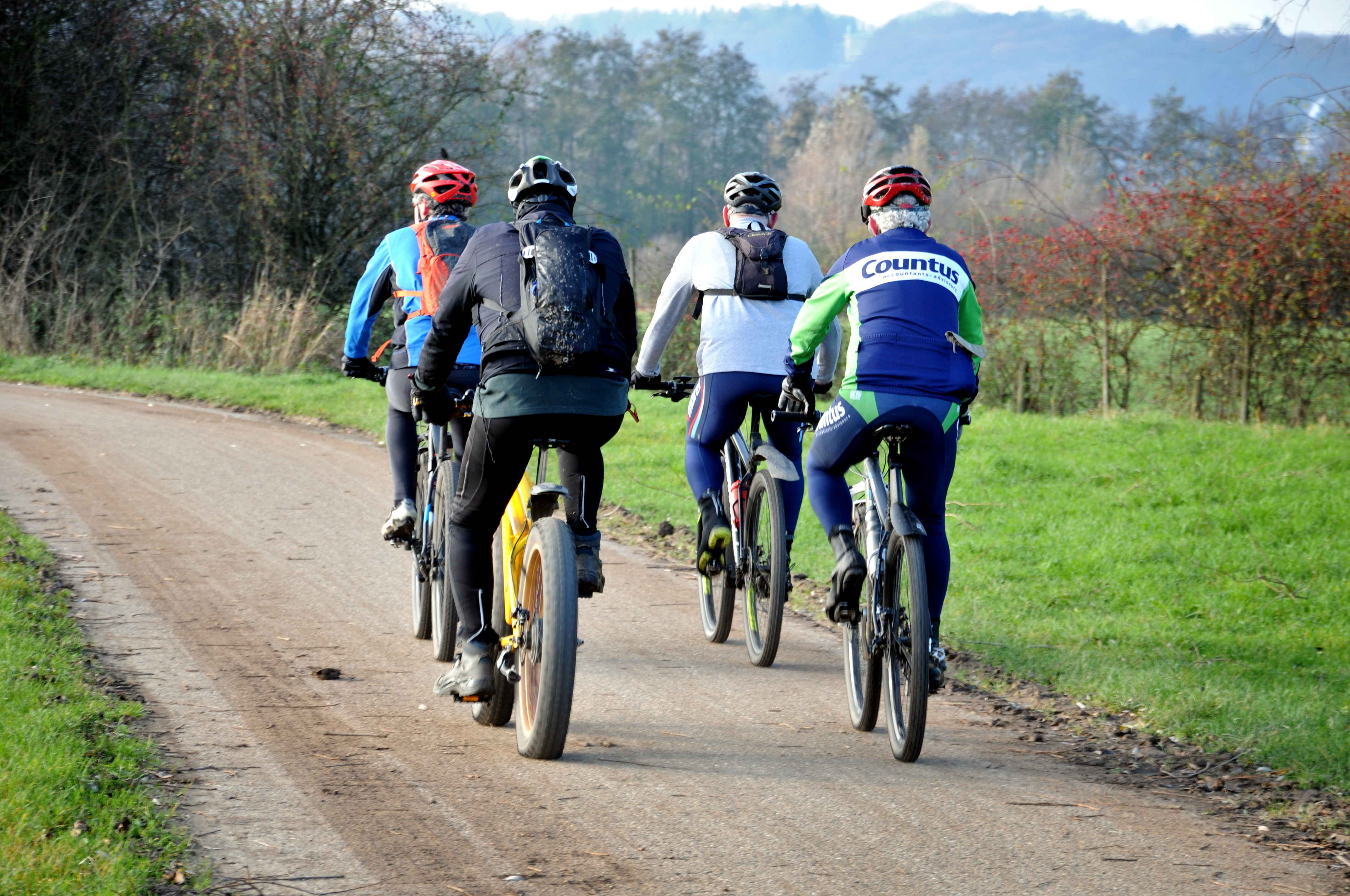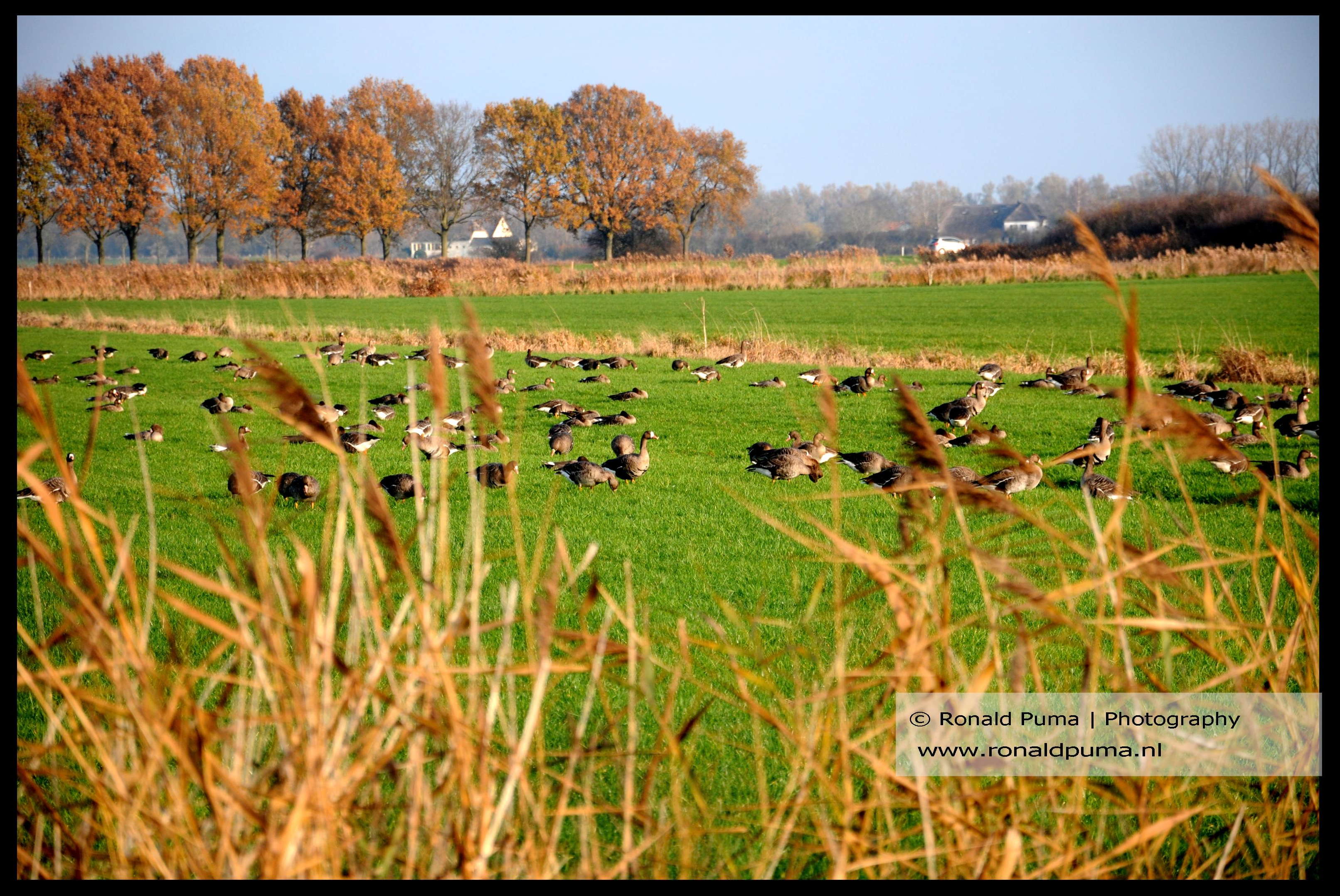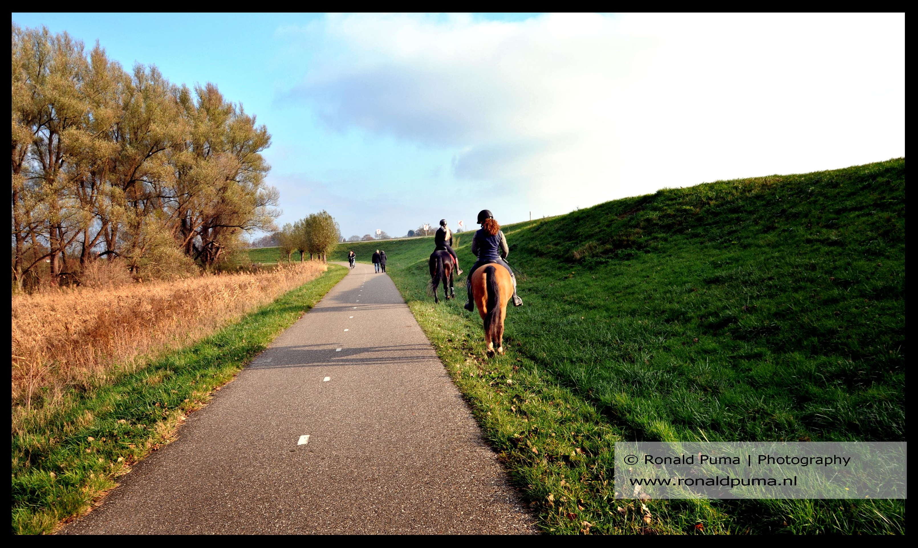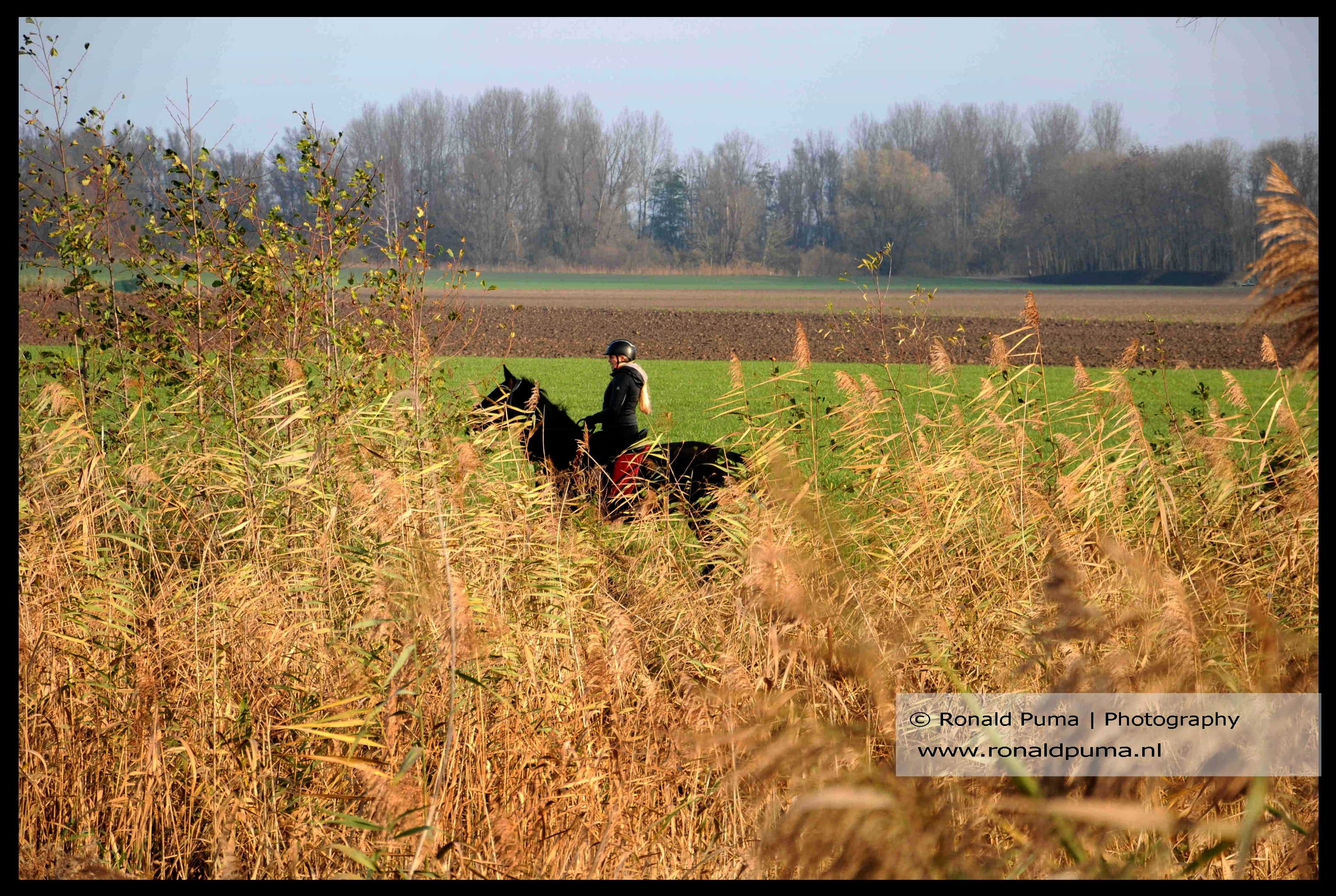 English language: On the photos a lowland area near the city of Nijmegen in the east part of the Netherlands with Geese, an agriculture field, reed, mountain bikers and a woman on horse.