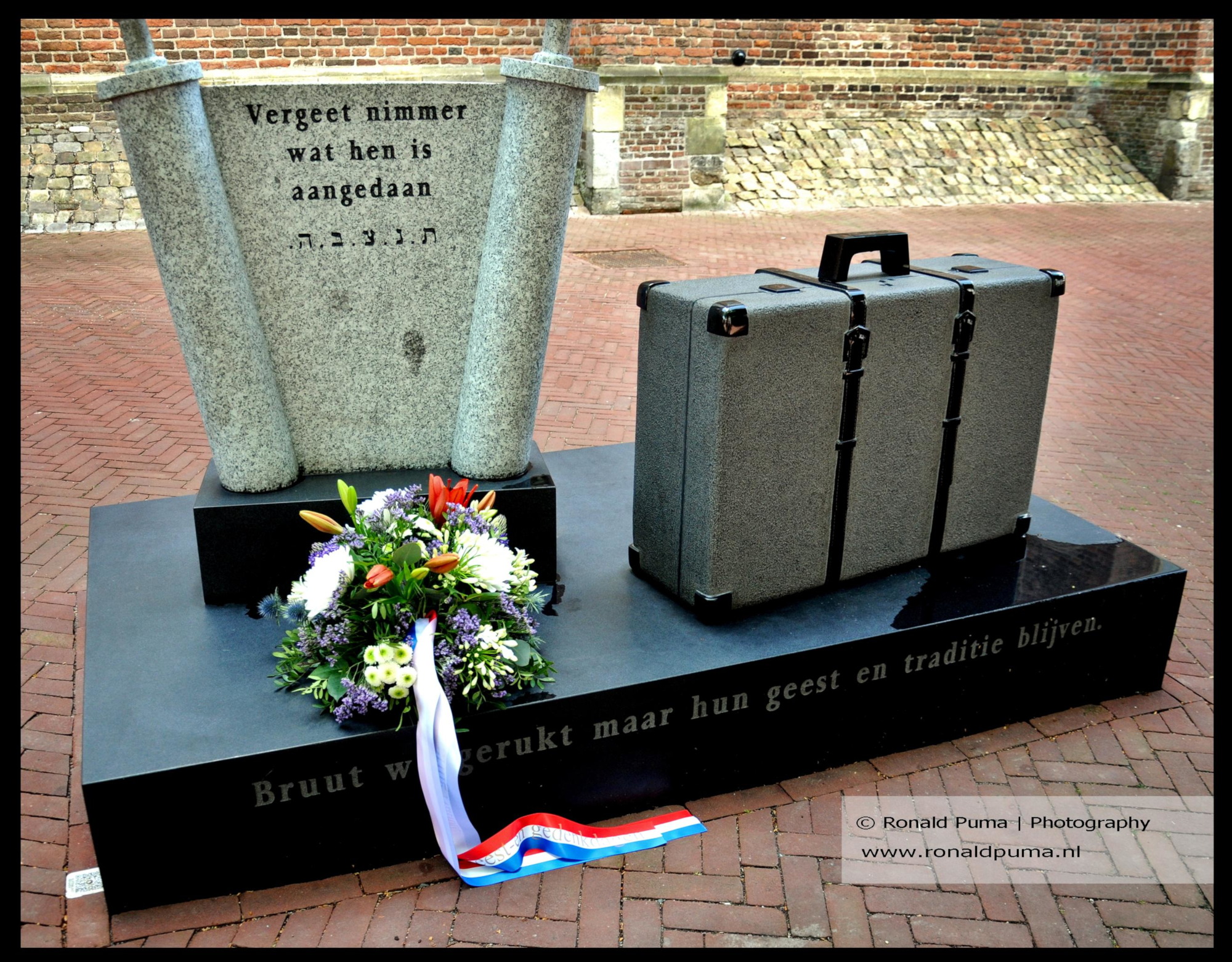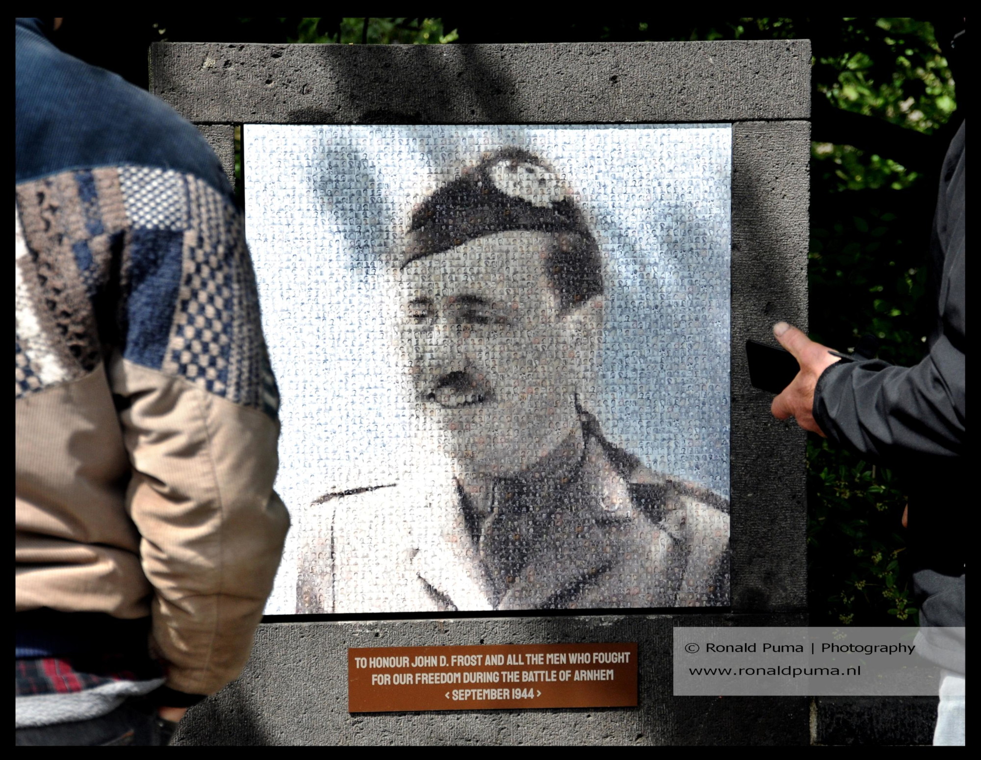 4 mei 2025. Dodenherdenking in Arnhem. Joods monument. Plaquette in de Bakkerstraat (5 burgers werden door de Duitsers gefusilleerd). Een bronzen plaquette bij de John Frost brug werd gestolen. Het tv programma Even tot Hier liet snel van foto’s van gesneuvelden een beeltenis van John Frost maken die op de plaats van de bronzen plaquette werd bevestigd (Britse legerofficier die in 1944 bij de brug het commando voerde).